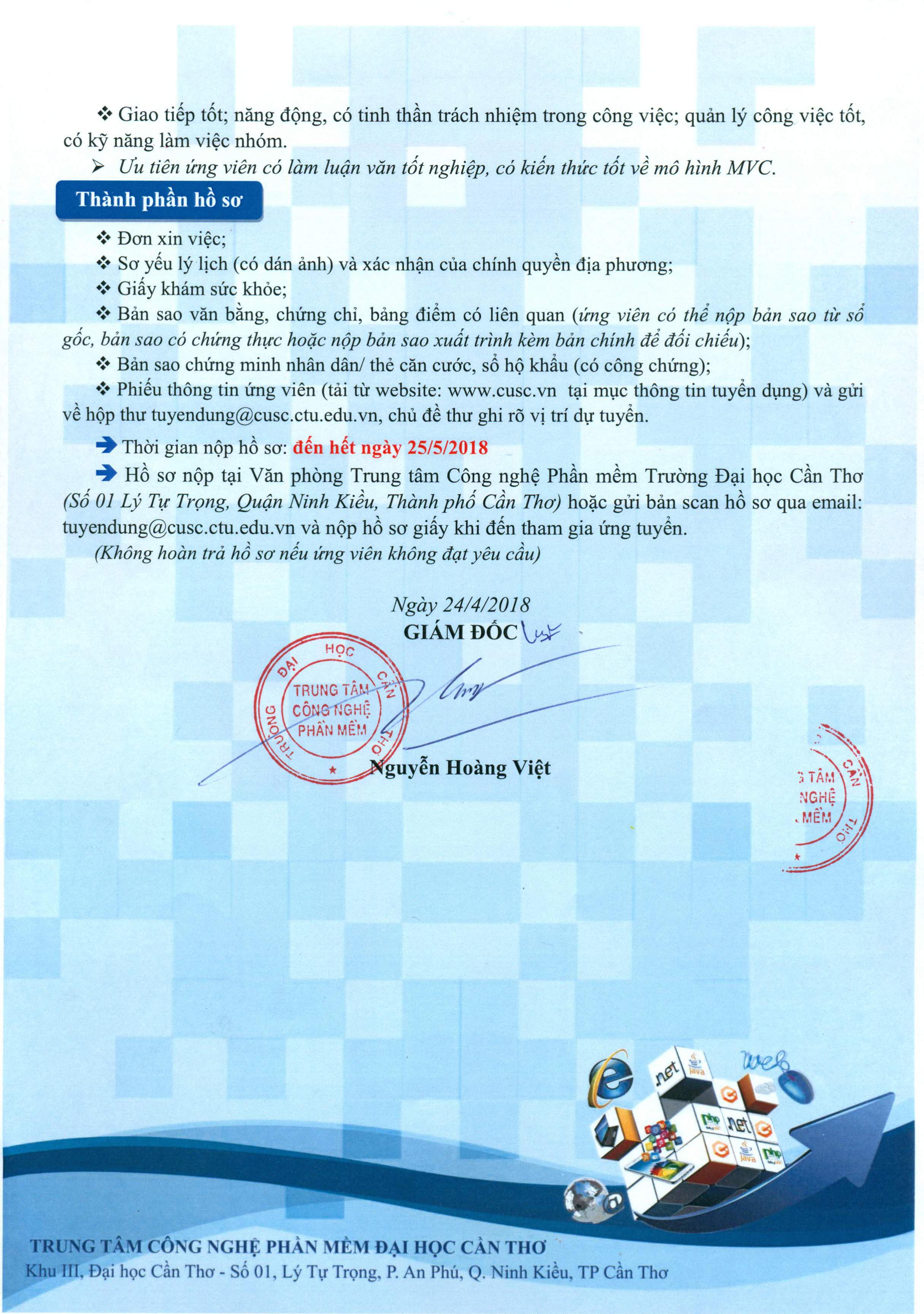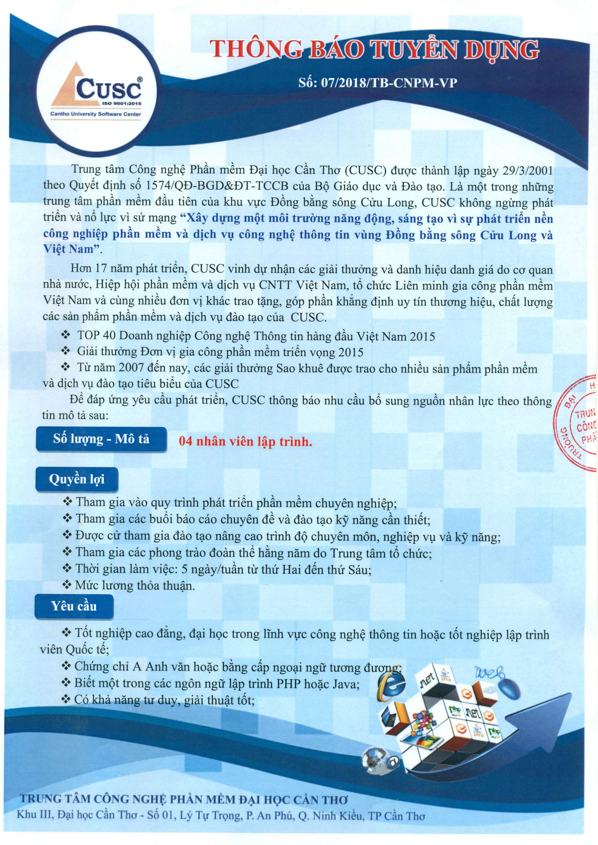 Thông báo tuyển dụng số 07/2018/TB-CNPM-VP